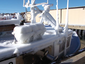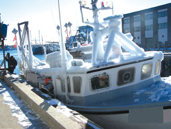 by Ann Backus, MS Icing And Fishing Vessel Stability According the Fishing Vessel Stability Training Program (December 6, 2003), a CD produced by the Society of Naval Architects and Marine Engineers Ad Hoc Panel #12, stability is the ability of a fishing vessel to return to its upright position after being heeled over by any combination of wind, waves, or forces from fishing operations The stability of a vessel is determined by the interaction of two forces, the center of gravity (COG) and the center of buoyancy (COB). The center of gravity is defined as the center of the weight of the vessel; this force pushes down. The center of buoyancy is the geometric center of the underwater portion of the vessel and its contents; this force buoys or pushes up. A technical discussion of these forces includes the description of the righting arm which is the horizontal distance between the COG and the COB. In an upright vessel the COB is directly under the COG. As the boat heels, the geometric center of the underwater portion of the hull and its contents, the COB, shifts to the outboard side and the COG does not change unless water comes aboard to change the weight of the vessel. The length of the righting arm (distance between the COG and COB) increases, and the buoyant force/righting arm counteracts the heeling forces and attempts to right the vessel. However, at some degree of heel that is specific for each vessel, the COB moves back toward the COG, passes directly under the Center of Gravity, and continues to the inboard side of the COG, creating a negative righting arm value at which point the boat capsizes. The movement of the COG back toward the COG is rapid and the vessel quickly becomes unstable. In conditions of icing the center of gravity is raised, because the weight is carried higher on the vessel. This creates a less stable situation. Picture a pole vaulter: The higher she is on the pole the more momentum she has for swinging over the bar. Not only is the COG higher under icing conditions, but the freeboard is reduced even in the upright position because of the increased weight of the ice. The two conditions: high COG and decreased freeboard create conditions in which the vessel can rapidly become unstable during heeling. The high COG increases the tendency to heel, and the decreased freeboard results in the flooding of the deck and possibly of watertight compartments above the waterline, thus causing the COG to move to a more outboard position (where the bulk of the onboard water is). The righting arm runs out to its maximum outboard position and back again, across the newly moved COG, very rapidly resulting in capsize at heeling angles that would not be a problem for the boat were it not loaded with ice. The situation is further complicated by the fact that icing is often accompanied by other de-stabilizing conditions. The table below lists what happens to the center of gravity and the freeboard in various situations. This table is a greatly simplified abstraction of information in the Fishing Vessel Stability Training Program CD. The importance of the table to this discussion is that icing, in combination with any condition that raises COG and/or decreases freeboard, presents an extremely dangerous condition. Stability must be preserved throughout the trip of the vessel. If tons of product are expected to be on board, then the weight of that cargo and whether it is stored below decks in small compartments to minimize the free surface effect or above decks where it raises the COG must be taken into consideration in order to avoid having the loss of freeboard and/or rise in COG contribute negatively to various wind, water, weather and fishing conditions that may arise during the trip. The Fishing Vessel Stability Training Program CD offers the following 10 suggestions (p. 50). Vessel Operations And Seamanship 1. Ensure all freeing ports in the bulwarks are kept clear for rapid draining of water on deck. 2. Keep bilges pumped to minimum levels to prevent free surface effects and minimize excess weight. 3. When heavy seas are encountered, -Suspend all fishing operations. -Secure all fishing gear and cargo to prevent shifting. -Head the vessel into the seas to minimize water on deck and the vessels motion. 4. Avoid operating in icing conditions. If icing cannot be controlled, leave the area immediately for shelter. 5. Avoid operating in following or quartering seas. They can cause heavy rolling or difficulty in steering especially when riding on the waves face leading to broaching. 6. When towing fishing gear, always use extreme caution. Tow the gear directly off the stern to minimize capsizing forces on the vessel. 7. When lifting, always use extreme caution. Whenever possible, secure the load to prevent shifting during the lift. 8. Minimize the time lifting heavy fishing gear over the side, such as retrieving purse seines. Perform these lifts only in sheltered areas. 9. Maintain effective means for quickly releasing any towed or lifted fishing gear in the event the gear snags an obstruction or the fish dive to prevent capsizing the vessel. 10. Carry an effective sea anchor to keep the vessels bow into the seas in the event of propulsion failure or loss of the ability to control the vessels heading. |
