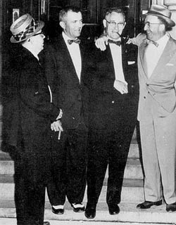 | Left to right: John Knight, Rodney Cushing, Leslie Dyer, and Alan Grossman at the federal courthouse in Portland, ME. The picture was taken during the price fixing trial. Photo courtesy of Barry Faber. The Great Lobster War, Ron Formisano, courtesy University of Massachusetts Press, Amherst, Mass. |