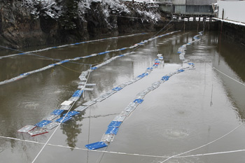 BBS Lobster, Bucks Harbor, Maine. BBS is a large pound and handles millions of pounds of lobster. Lobster in the water are aerated and the shells hardened for shipping. Christmas and New Year are big seasons. Lobster is shipped from here to Bourne, MA where it is iced down and packed in foam boxes to be air freighted from Boston and New York. Western Europe is the biggest market currently. ©Photo by Sam Murfitt