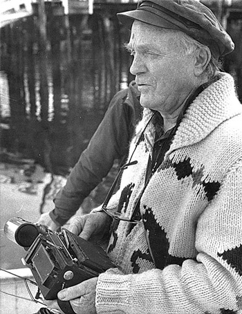 In a pensive mood on the waterfront, Boutilier is studying the angle from which to make his next shipyard shot with his ever present Graphics 4x5 news camera. Red photographed the Maine waterfront and was the first to make boat launches a news event. Photo courtesy Everett Boutilier.