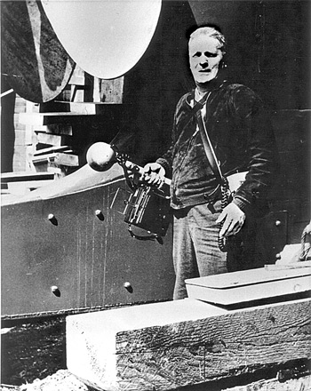 Red Boutilier. Shooting at what is likely the Harvey Gamage yard in South Bristol, Maine, given the size of the propeller in the background and what looks like a metal hull. Photo courtesy Everett Boutilier.