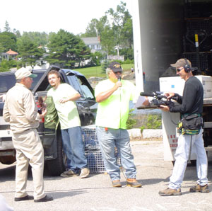 Left to right; Andy Gove, Travis Otis, Keith Otis, officiating at the 2007 Searsport lobster boat races, and Gene Landry of Persistence Media, Portland who filmed the races that day. Brenda Tredwell photo |