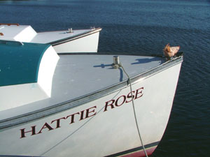Weve got the only boat in the circuit consistently racing with a couch, says Keith with a look so serious, you know he cant be. Keith and Travis chair the Searsport Races, famous for the excellent prizes, many from the generosity of Hamilton Marine. Its also an infamous race, because of the traditional pig roast held under the moon on the eve of race day. Nobody rises to an occasion like Steve WILD ONE Johnson. Maybe the moon was full that one night, because somehow, he got hold of the pigs head. Since he just happened to have a tube of 5200 on hand, he thought hed give a car a hood ornament. To get even, the victim removed the head and stuck it on the bow of Johnsons HATTIE ROSE. Superstition got the better of hima pig on a boat isnt cool.