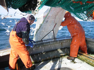 Dave Goethal, left, and deck hand Paul Kuncho hauling back one of the new topless shrimp trawls off New Hampshire. Goethal participated in the collaborative research project that led to the development of this gear. At the stern is the escape vent, bounded by dark rope, in the net extension, with a nordmore grate that filters out by catch behind it. Photo courest of Pingguo He, UNH Research Scientist |