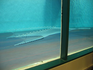 Scale model topless net, 30 feet long, in a tow tank in St. Johns, Newfoundland. The basic strategy in developing gear is to use scale models to study performance. Photo courest of Pingguo He, UNH Research Scientist |