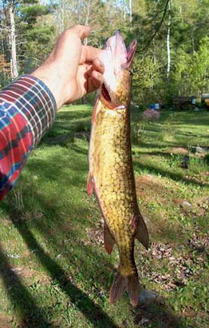 Chain pickerel typically weigh 2 pounds or more and attain lengths of well over 20 inches. The Maine record pickerel weighed 7.02 pounds. And doubtless, larger specimens have been caught, cooked and eaten, without being weighed or measured. Photo by Tom Seymour |