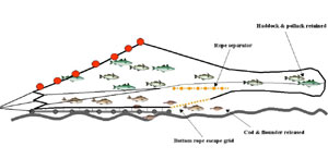 In recent years a number of changes have been developed for groundfish gear. Most of these have involved the redesigning of trawl gear used as early as the late 1800s. The changes to existing gear have reduced bycatch. But, said Glass recently, habitat impact is a more important issue than bycatch reduction. Glass has been working on developing what he described as almost futuristic ideas for addressing habitat impact. He is developing techniques for trawling without scraping the bottom to herd fish up into a net. These ideas are, at this time, in the conceptual stage. It is the scraping of the bottom with gear, said Glass, that disturbs and can destroy where groundfish feed, breed and live. With less and less intact bottom on which to grow, there are just fewer fish. Sea Grant at UNH worked with fisherman Carl Bouchard and Associated Fisheries of Maine to develop the Rope Separator Trawl. The redesigned trawl helps separate cod and haddock. Another trawl Glass worked to develop, and which won the Smart Gear competition in 2007, is the Eliminator Trawl. The Superior Trawl Company developed this trawl with Rhode Island Sea Grant researchers. Marine biologist and Glass colleague, Pinnguo He of UNH Sea Grant, devised a system that recombined net patterns, and used fish behavior data to sort out species. The net was a composite of the old cod end. A mix of square and diamond shaped mesh enabled the net to use the selective efficiencies of both designs. Glass newest gear design ideas break away from the 1800s model that most redesigned gear is based on and uses new technology, such as light and lasers, with data from fish behavior research gathered over recent years. Glass said that fish respond to visual stimuli from the presence of a net, not necessarily the physical contact. The net does not need to touch them in order for them to react. From this Glass began thinking about the use of laser light to mimic the webbing of a net and create the illusion of a net. The light would stimulate the fish to respond, and then move in the direction of the actual net without gear making contact with the bottom. Glass said there is a lot of scientific thinking that can be brought to fisheries management problems. However, a major concern for scientists working on gear development, is that within the standard management model, management seeks to reduce effort, rather than find sustainable uses of technology. There is considerable difficulty, he said, in getting funding for research that looks for options that are off the beaten path. Most funding, he said, comes from answering a part of a problem, within a time frame that is useful to management. |