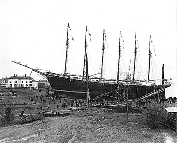 | Launching day: The Wyoming. Percy and Small Shipyard, Bath, Maine. 12/14/1909. 329’x50’x30’. The last six-masted schooner built and the largest wooden sailing vessel ever built. 3,730 gross registered tons. 450’ tip of jibboom to tip of spanker boom. Keel laid 4/5/1909. Ground tackle 240 fathoms of anchor chain and two cast steel anchors weighing 60 tons. Capacity: 6,000 tons of coal. Otis M.E. Card/F.J. Rollins. Photo: courtesy of Richard Card |