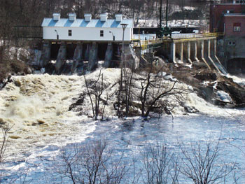 The Milltown Dam at Calais on the St. Croix River. Built in 1880, the original fish ladder entrance was under the building at right. The open fishway is Canadian operated. Passage of alewives was blocked at Woodland and Grand Falls dams in response to commercial sporting camp owners in 1995. Alewives are native to area ponds. A bill to re-open the Woodland dam passed unanimously on March 26. Chessie Crowe Gartmayer photo |