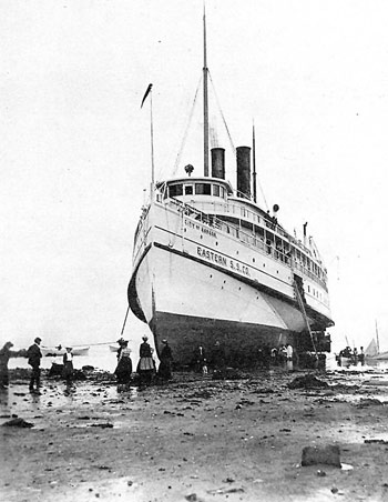 | The City of Bangor struck on Monhegan Island in thick fog on September 28, 1902 and was run onto Lobster Beach to prevent sinking. Launched in 1894, she steamed the Penobscot River becoming one of the legends of the steamboat era. Photo: Deer Isle - Stonington Historical Society |