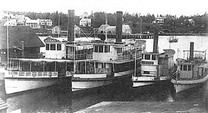 Smaller steamers at Boothbay. Left to right the Wiwurna, Nahanada, Samoset and an unidentified steamer. As many as fifty boats like this carried passengers, mail, livestock and supplies on Moosehead Lake. By the 1930s there were roads around the lake and steamboat service declined. The last of them, the Katahdin, towed booms of logs until 1975. Photo: Boothbay Regional Historical Society.