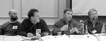 L. to R: Paul Parker, Geoff Smith, Vito Giacalone, Terry Stockwell. “As a result of the soaring cost of permits, the public’s resource has been converted to the private sector. It is now a privatized right.” Paul Parker, Cape Cod, “Framework 42 put the Port of Gloucester out of business.” “The permit bank gives people something to hope for.” Vito Giacalone, Gloucester. The Gloucester bank has bought 29 permits to date. ©Photo by Sam Murfitt