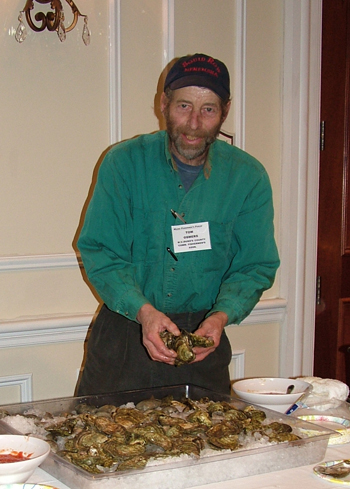 Tom Osmers at the Maine Fishermen's Forum in Rockport 2008 giving Martha's Vineyard oysters to fellow attendees. Fishermen's Voice Photo