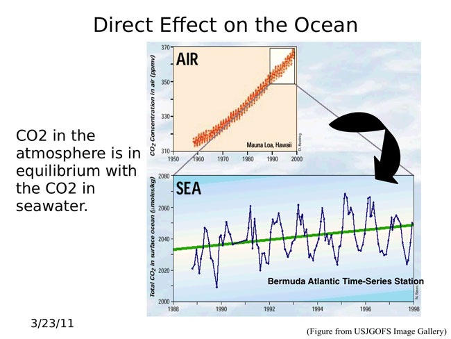 This issue is not about global warming. There is no debate about CO2 levels rising 1 1/2 parts per million (ppm) every year. It cannot be debated that rising CO2 causes rising acidity in the oceans. Pre-industrial atmospheric CO2 levels were 220ppm, today they are 385ppm.