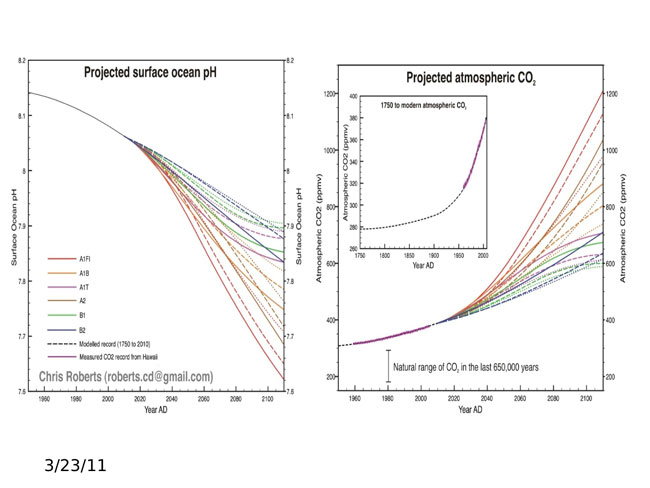 Computer modelers have predicted that with increased use of fossil fuels and deforestation CO2 levels will be at 750ppm by 2100, said Salisbury. The problem of increased CO2 causing acidification has only been getting a close look for about a decade. How these increases will actually play out and what the consequences will be are effectively unknowns at this time.