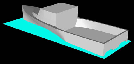 Computer Aided Design image of a proposed lobster boat that would use 30 percent less fuel. The tri-hull design was developed by Maine Maritime Academy naval architect and engineer Doug Reed. The boat incorporates a trimaran hull which dramatically reduces drag, with a lobster boat work platform. MMA Image