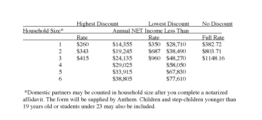 Your monthly premium rate (cost for the plan) will take into account your age and where you live. You may fill out financial statements to see if you qualify for a discounted premium. There are four levels of discounts available. Below I have listed only the highest and lowest incomes that will qualify you for a discount and the approximate rates for households with one to three persons. The annual income amounts in the chart below are based on NET income (your income after expenses).