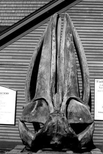 | Skull from a 60+ foot Fin whale. The sperm whale that attacked the Essex was about 85 feet long and weighed 80 tons. The battering ram front end, with the cushioning from the large oil cavity its head, made them potentially dangerous to whaling ships, but they seldom were. Whale boats, on the other hand, were regularly dumped, crushed or taken on a “Nantucket sleigh ride” that could reach 25mph after the whale had been harpooned. NOAA photo |