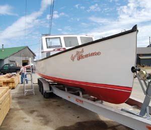 Lorna Rs offspring Foolish Pleasure in Jonesport recently. The glass hull was built from the mold pulled off the Lorna Rs wood hull. In this make over Lorna Rs 7,000 + lbs. was trimmed down to a slim 2,380 lbs. 650 of that is engine. Brenda Tredwell photo