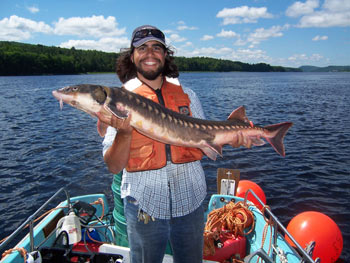 Stephen Fernandes of the University of Maine at Orono, holding an eight year old short nose sturgeon caught in mid June in the Penobscot River. Catching the fish was part of a research project that includes tagging the endangered sturgeon. A small number of sturgeon have been inhabiting the river, but live on the bottom and are not often seen. Photo: Christopher Holbrook