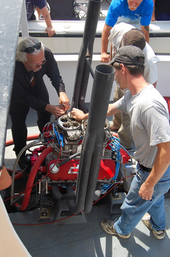 Richard Weaver (left) at Beals with his son, Richard, Jr. adjusts former client, Galen Alley's big block engine after a hot run on FOOLISH PLEASURE. Brenda Tredwell Photo