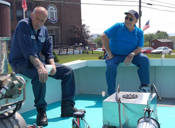 Ellery Alley with Ernest Libby, Jr. aboard Underdog, trailered in front of Main Street Auto, Jonesport, July 3rd, 2008. Brenda Tredwell Photo