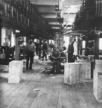 Shoe-pegging machines, for attaching outsoles to insoles, in a Norway shoe shop, early ’70s. This factory was built by the town in 1873 to attract a Lynn, Massachusetts, shoemaker. The cases in the foreground are stenciled “B.F. Sturtevant, Boston, Mass.” The first popular automatic shoe-pegging machine was invented by B.F. Sturtevant about 1857. Pegs were made from sapwood of birch or maple. In 1880, about half the shoe shops in the country produced machine-pegged shoes. An 1880 description of the machine explains all:
