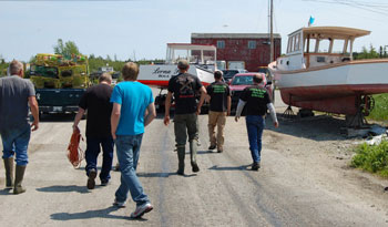 Jonesport, June 2011. Racing engine mechanics, fishermen, enthusiasts and observers at the epicenter. Far right is engine mechanic Bob Stevens down from Augusta to tweak the 638 Merlin in Foolish Pleasure. Brenda Tredweell Photo