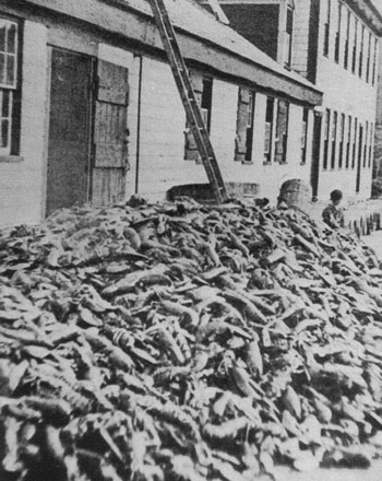 A less fastidious lobster processing operation in the early days of canning lobster. M.L.Perin's cross country trip to California with live lobster was a high-tech laboratory experiment compared to this operation in the same era- 1870.