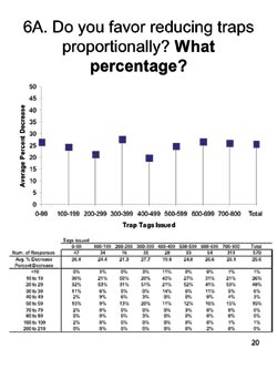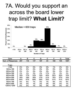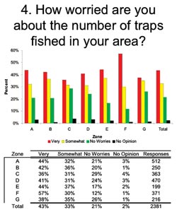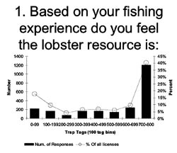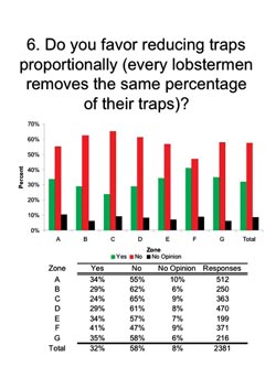 More pertinently to the point of the survey, fishermen responded with concern about the number of traps in the water. About three-quarters said they were very or somewhat worried about trap numbers. More than half said they would support reducing the number of traps in their area. When asked about the mechanism for reduction, about half said they supported a proportional cut, where every lobsterman removes the same percentage of traps; the median decrease was 25 percent. On the other hand, half said they would support an across-the-board cut, with a median trap cap put at 600. Fishermen were pretty evenly split on whether to freeze entry of new licenses into the fishery. They were also split on the question of whether to freeze the number of tags for those already holding commercial licenses. Surprisingly, there was also no consensus on whether to eliminate latent effort. George Lapointe on the survey "One of the most important aspects of the survey was the level of participation," said Commissioner Lapointe of the survey. Of the licensed lobster fishermen in Maine 35% responded to the survey. A number considered very high. "It shows people in the lobster industry are concerned about the fishery," said Lapointe. "People are interested in meaningful and fair action on effort. The message we are hearing from the survey is that whatever we do must be fair, but we're not sure what that is yet." The lobstermen with a small number of traps voted differently from the large holders. The last time we went from 1200 traps to 800, the fishermen with 1200 felt they sacrificed while those with 400 benefited. At the same time there are some who fear a loss in the number traps will make them part time lobstermen. The Advisory Council
