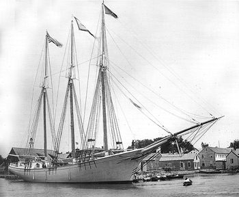 Kennebunkport, 1890. The schooner Golden Ball, newly launched from the yard of David Clark, floats in the Kennebunk River. About 2,250 three-masted schooners were built on the East Coast, the vast majority from the end of the Civil War to World War I; about a thousand of these were built in Maine. Twenty-eight were built on the Kennebunk. Of the eleven built by David Clark, several were particularly notable. The George V. Jordan, built in 1874, twice made two-year world voyages, once sailing from New York to Sydney in but ninety-six days. The long-jibboomed Lavinia Campbell was among the handsomest members of the coal fleet. The Bradford C. French, at 900 tons, was the largest member of the breed.