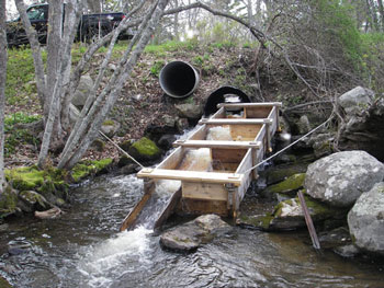 Something as relatively simple as a fish ladder can be immensely complex to get right. In the example depicted here a small ladder designed by David Wilkins of Bremen required considerable trial and error to get right. Here again communal decision-make is paramount for even the smallest ladder often requires coordination between interest groups and across juristictions. Note the round culvert in the image that can be an impediment to fish passage. Changing culverts means intensive interaction with town and county governments. The US Fish and Wildlife Service estimates that virtually none of the culverts in the State of Maine are compatible with fish passage. Photo by David Wilkins
