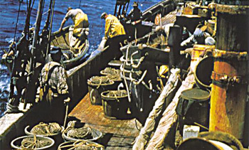 Deck of the Adventure during active fishing years. On deck are the tubs of trawl line and hooks. The dory being boarded will be loaded with the baited tub trawls. Two fishermen per dory would have set and hauled three loads of trawl lines in a day. Schooner Adventure Photo