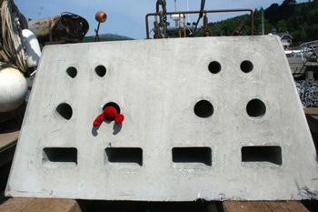 The first habitat mooring is a smooth concrete block that weighs 4,000 pounds. It is penetrated by tunnels and channels of various diameters.