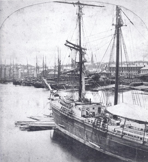 River water was fresh, and the steward of the Loring has rigged a line for the cabin’s laundry. Drying wash, drying sails, and the flags of foreign vessels created a carnival air. On some fine evenings, sailors gathered on deck to sing and make music; on others they battled—fights between British and “Dago” crews were especially bloody.