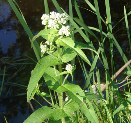 In August and into September, boneset develops fuzzy, white flowers, borne in flat clusters. Once identified, this plant is never forgotten, since nothing else looks quite like it.