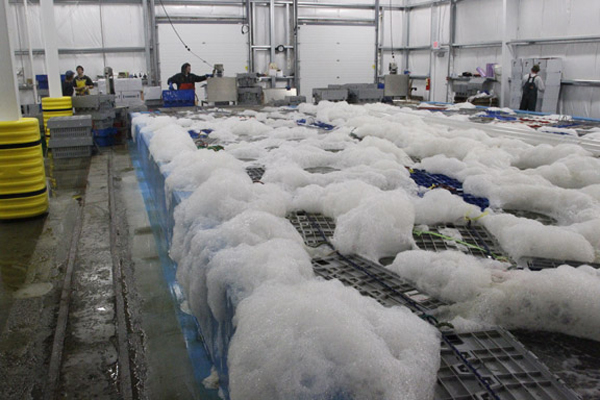 Tank room at Linda Bean’s Maine Lobster in Rockland, ME. Crates of lobster are kept at low temperatures to reduce shrinkage. Some of these lobster will be shipped live and others processed in another part of the operation. Bean’s processed lobster is cooked and shipped frozen. ©Photo by Sam Murfitt