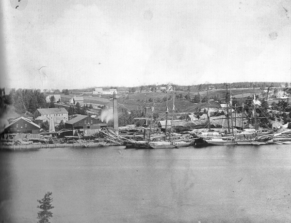 A half-brig and a bark lie alongside the wharf; two two-masted schooners– one is a monster–lie outboard. A third schooner lies beyond the bark. The schooners are receiving deckloads of lumber loaded from scows; a scow is being loaded at the north mill. The brig and the schooners are floating deep in the fresh water, but they will gain freeboard in more buoyant salt water.