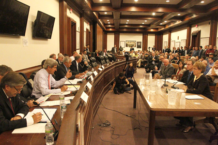 A Congressional hearing was held October 3, 2011 to address dramatic consolidation of the New England fishing fleet into the hands of fewer vessel operators. The 2010 catch shares and NOAA have been faulted for the loss of jobs and businesses. Assembled in hearing room A-1 at the state house in Boston were near left, Rep. John Tierny, Sen. Scott Brown, Sen. John Kerry and Rep. Barney Frank, and Near right Chief NOAA Administrator Jane Lubchenco, and Asst. Administrator Eric Schwabb. See accompanying story. ©Photo by Sam Murfitt