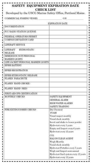 by Ann Backus The year 2008 will expire December 31. Your safety gear has expiration dates also. Occasionally at this time of year, I write an article with a list of suggestions for holiday gifts to give fishermen. Well, here is a different list to complete that could result in some gift giving ideas (if a safety item will soon expire). Alternatively, it could be a list (“checking it twice”) that you complete and take action on to give yourself and your family some safety assurance for 2009. The idea is…clip out the list, make a copy on white paper, complete the expiration column, and keep the sheet in a plastic sheet protector. As you check expiration dates, test the equipment that requires testing. Documentation: federally documented or state registered? Check the dates on your papers and be sure all the papers are present. Consider making copies and storing a set of your documentation papers at home. Let someone know where the papers are. FCC Radio License and Federal Operators Permit: If you wish to conduct business with the FCC, you must first register through the FCC’s COmmission Registra- tion System (CORES). Upon registration, you will be assigned a FCC Registration Number (FRN). This number will be used to uniquely identify you in all transactions with the FCC. The website www.fcc.gov or the http://wireless.fcc.gov/uls/index. htm?job=home or http://wireless. fcc.gov/commoperators/rp.html are good places to start if you need to update your radio license, pay the fee, or become a licensed operator. Radio telephone requirements apply to all power driven vessels over 65 feet. Compass Deviation Card: According to the website "http://www. sailtrain.co.uk/navigation/deviation.htm" http://www.sailtrain.co.uk/navigation/deviation.htm if you have changed gear on your boat or been struck by lightening, (or just for safety’s sake) you should check the deviation on your compass card. Many of the boats I have been on recently have replaced compass and compass card with GPS equipment, however, should your GPS not be functioning correctly, you might need to rely on a compass and know the deviation to apply to each heading. Life raft service and life raft hydrostatic release: Life rafts must be serviced annually. The hydrostatic release must be clearly marked with an expiry date in order to meet regulations. Two years between servicing is usual for non disposable releases. The key here is to have the servicing done by a provider “specifically approved by the US Coast Guard” and to avoid buying a cheap brand of hydrostatic release because there have been cases of poorly manufactured weak links that failed to break as specified in USCG regulations. EPIRB battery, registration, and hydrostatic release: Check the battery expiration date and test the EPIRB every month. In the winter, testing prior to every trip is a good idea. Be sure your EPIRB uses the 406 mega Hertz (MHz) frequency as the 126 MHz is no longer in service and be sure your EPIRB is registered with NOAA. The registration website is www.beaconregistration. noaa.gov. The hydrostatic release will be marked with an expiration date which is usually two years after purchase. Flares: Every type of flare will have an expiration date imprinted on it. Hand-over expired flares to your local US Coast Guard Marine Safety Officer to use for training purposes and purchase a new batch for yourself. First Aid and CPR Certification: Check your certification cards for expiration dates. The American Red Cross and the American Heart Association differ in the time between certifications. In 2005 the AHA issued new guidelines for administering CPR. Perhaps it is time to take the First Aid and/or CPR courses again. Monthly checks: Complete the suggested checks and keep a dated log noting anything that you want to check again or inquire about. Fire extinguishers: The Commer- cial Fishing Vessel Safety Act of 1988 specifies the type and placement of fire extinguishers. Vessels as small as 16 feet are required to have a fire extinguisher (B-I) if there is a chance of entrapment of gases. For vessels over 65 feet extinguisher types A,B, and C are required and their location such as corridors, service rooms, galleys, paint rooms, engine rooms, etc. are specified. Follow the directions for checking your fire extinguishers based on the types of extinguishers and check for rust/corrosion on the body of the canister especially around the bottom rim. Recently a tragic death resulted when an activated extinguisher with propellant separate from the fire suppressant exploded through the bottom of the corroded canister and propelled the canister into the user. |