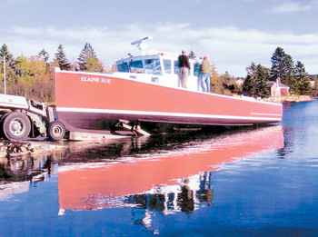 | One of a Kind. The 43' wood lobster boat built by owner and fisherman Danny Backman being launched at Winter Harbor October, 2008. Fishermen building their own wooden boats has become very rare. From a boat building family, Backman took the lines off one of the boats his grandfather Otto built. Photo by Bernice Johnson |