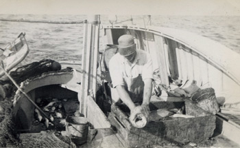 Clifford Raynes on the Blanche R fishing cod off Vinalhaven 1940. Photo courtesy of Paul Molyneaux