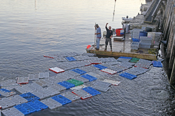 Loading lobster crates at JJ Lobster, Rockland, Maine. A healthy lobster resource, very low lobster prices, rising bait prices, expensive fuel and questions about the introduction of new bait species are all a part of the challenge to find profitability for lobstermen. ©Photo by Sam Murfitt