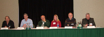 The afternoon panel discussion at the second Annual U.S./Canadian Lobstermens Town Meeting included from left, Joe Iodine, US; Doug Pezzack, Canada; Jim Wilson, US; Diane Cowan, US; Harry Mears, US, and Jim Jamieson, Canada. Photo Fishermen's Voice