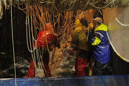 Setting at night on the northern edge, Grand Banks. The recent release of a National Marine Fisheries Service assessment of New England cod stocks has caused fishermen, congressmen and the most conservative environmentalists to question the assessment's data. While fishermen report seeing a lot of cod the assessment data will result in cod quota cuts to a ground fish industry already reeling from a new catch share program that has put many fishermen out of business. ©Photo by Sam Murfitt