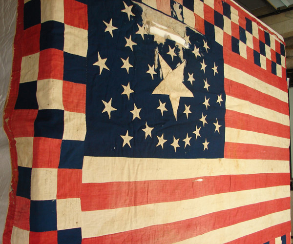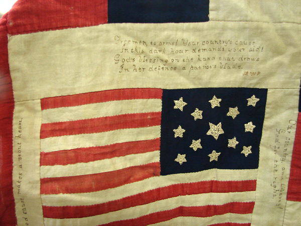 “As a diversion from real work it was proposed to make a Flag Bed Quilt for a hospital. Preparations were made at once, a committee was chosen to purchase the materials, and at a meeting at the Unitarian Parsonage the quilt was designed, cut and prepared for willing hands to finish. It was of a good size, made like a flag with a red and white border. The names of all the members were written in the white stripes, appropriate mottoes were in every star and where some pun or play upon the Union Officers names could be made, it was quickly incorporated. The idea was like this: a hard resting place for the rebels – “General Pillow”. A bus to the rebel progress, “General Gates.”