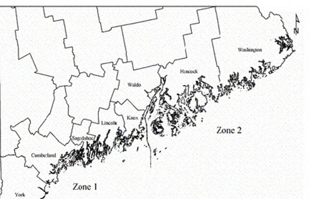 The coast of Maine is divided into two management zones for the urchin fishery. The division line between Zone 1 and Zone 2 occurs in Penobscot Bay. Along the western half of the coast, York, Cumberland, Sagadahoc, Lincoln, and part of Knox counties make up Zone 1. To the east, Hancock, Washington, and part of Knox counties make up Zone 2.