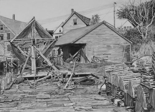When you see a Jen Casad picture, you could easily mistake it for a fine black and white photograph. Her detailed, accurate pencil drawings document the midcoast fishery, and her work has recently been on exhibit at a New York City gallery. She is excited about an upcoming exhibit at a maritime museum in Spain.