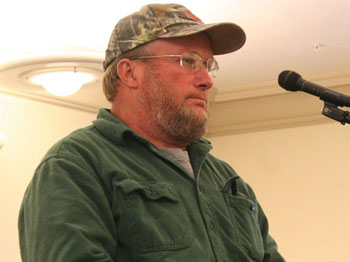 A handful of lobster fishermen attended a DMR hearing on a management framework for an island limited entry program, June 4 in Ellsworth. “I feel strongly that whatever island it is should have whatever licenses they want.” Ken Lemoine of Swans Island. Laurie Schreiber Photo