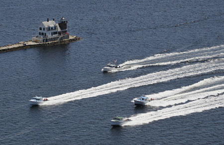 Rockland, June 17. Good weather and a good turnout of racers made the day at Rockland for the Maine Lobster Boat Races. Boothbay held their event on Saturday. The Rockland lighthouse and breakwater are in the background. More exclusive race photos by Sam Murfitt appear on pages 12 and 13. ©Photo by Sam Murfitt